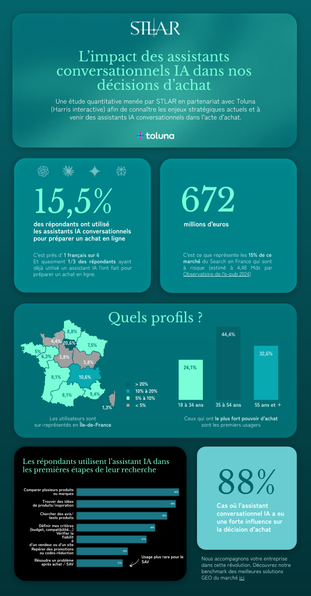 L'enquête quantitative L’impact des assistants IA conversationnels dans la décision d’achat, menée par STLAR en partenariat avec Toluna, avec pour sujet les assistants IA (intelligence artificielle) conversationnels, dévoile des résultats utiles pour les entreprises du commerce, les distributeurs, et les métiers du marketing.
